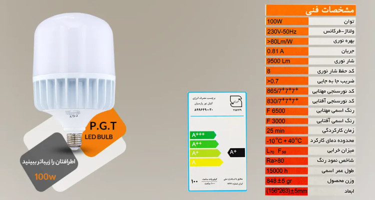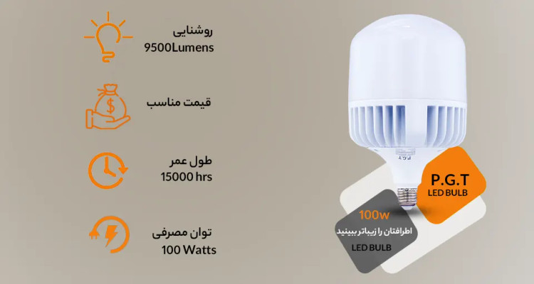 لامپ ال ای دی 100 وات استوانه ای یکی دیگر از لامپهای بزرگ و پرنور شرکت پی جی تی (PGT) است. در زیر به بررسی مشخصات ظاهری و فنی این لامپ پرداخته شده است: