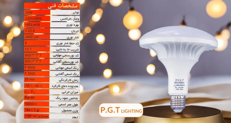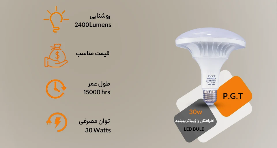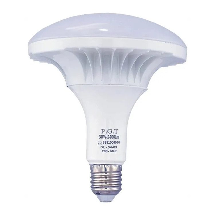 بدنه لامپ قارچی 30 وات پی جی تی طوری طراحی شده است که تمام نور را در یک جهت پخش میکند. به همین این لامپ ممکن است برای برخی مکانها مناسب نبوده و برعکس برای فضاهایی که نیاز به روشنایی در یک جهت دارند ایدهآل باشد. لامپهای با شکل ظاهر متفاوت، مانند لامپ استوانه ای یا لامپ حبابی زاویه تابش نور بازتری نسبت به لامپ قارچی دارند.