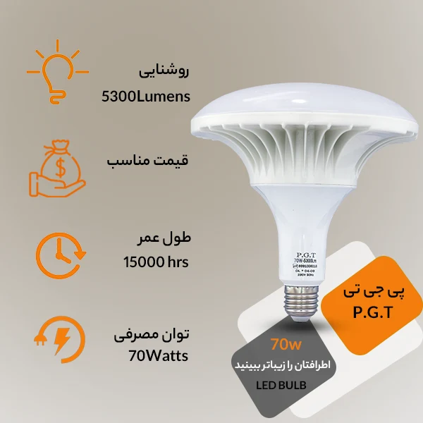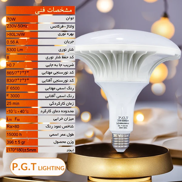 مشخصات لامپ سفینه ای 70 وات PGT شکل ظاهری: قارچی یا سفینهای توان مصرفی: 70 وات شار نوری: 5300 لومن رنگ نور: آفتابی یا مهتابی (دارای قابلیت انتخاب توسط خریدار) طول عمر: 15000 ساعت مصرف انرژی: +A نوع سرپیچ: E27 نکات مهم قبل از خرید لامپ قارچی 70 وات PGT محیط استفاده: لامپ ال ای دی قارچی 70 وات PGT برای استفاده در محیط مرطوب مناسب نیست. رنگ نور: رنگ نور این محصول قابلیت انتخاب دارد لذا در زمان خرید دقت نمایید که متناسب با نیاز و سلیقه خود رنگ نور مورد نظر را انتخاب نمایید. دیمر: این لامپ قابلیت کمسو شدن را ندارد.
