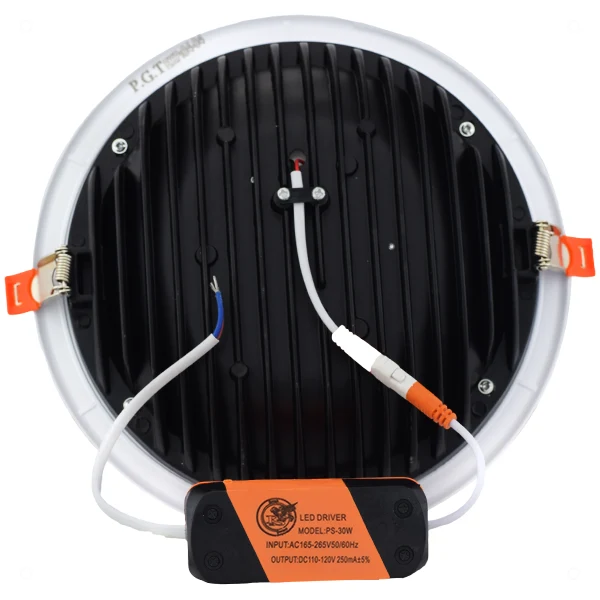 چراغ COB سقفی توکار گرد ۳۰ وات دارای درایور خارجی باکیفیت است که نقش مهمی در بهبود عملکرد و افزایش طول عمر آن دارد. این چراغ با قطر دهانه 22 سانتیمتر و عمق 60 سانتیمتر ساخته شده که برای نصب در سقفهای کاذب و مکانهای مختلف بسیار مناسب است.