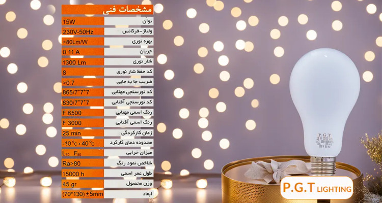 لامپ ال ای دی حبابی 15 وات پی جی تی PGT با سرپیچ استاندارد E27 با طیف وسیعی از سرپیچهای مرسوم در بازار برق ایران سازگار است.