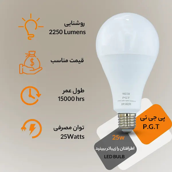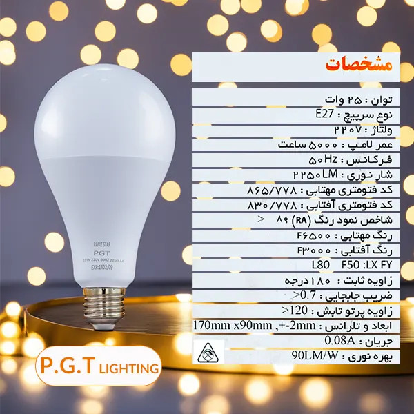 لامپ ال ای دی 25 وات حبابی یکی دیگر از محصولات تولیدی شرکت پی جی تی (P.G.T LIGHTING) است. در بخشهای زیر به بررسی کامل مشخصات ظاهری و فنی این لامپ ال ای دی پرداخته شده است: